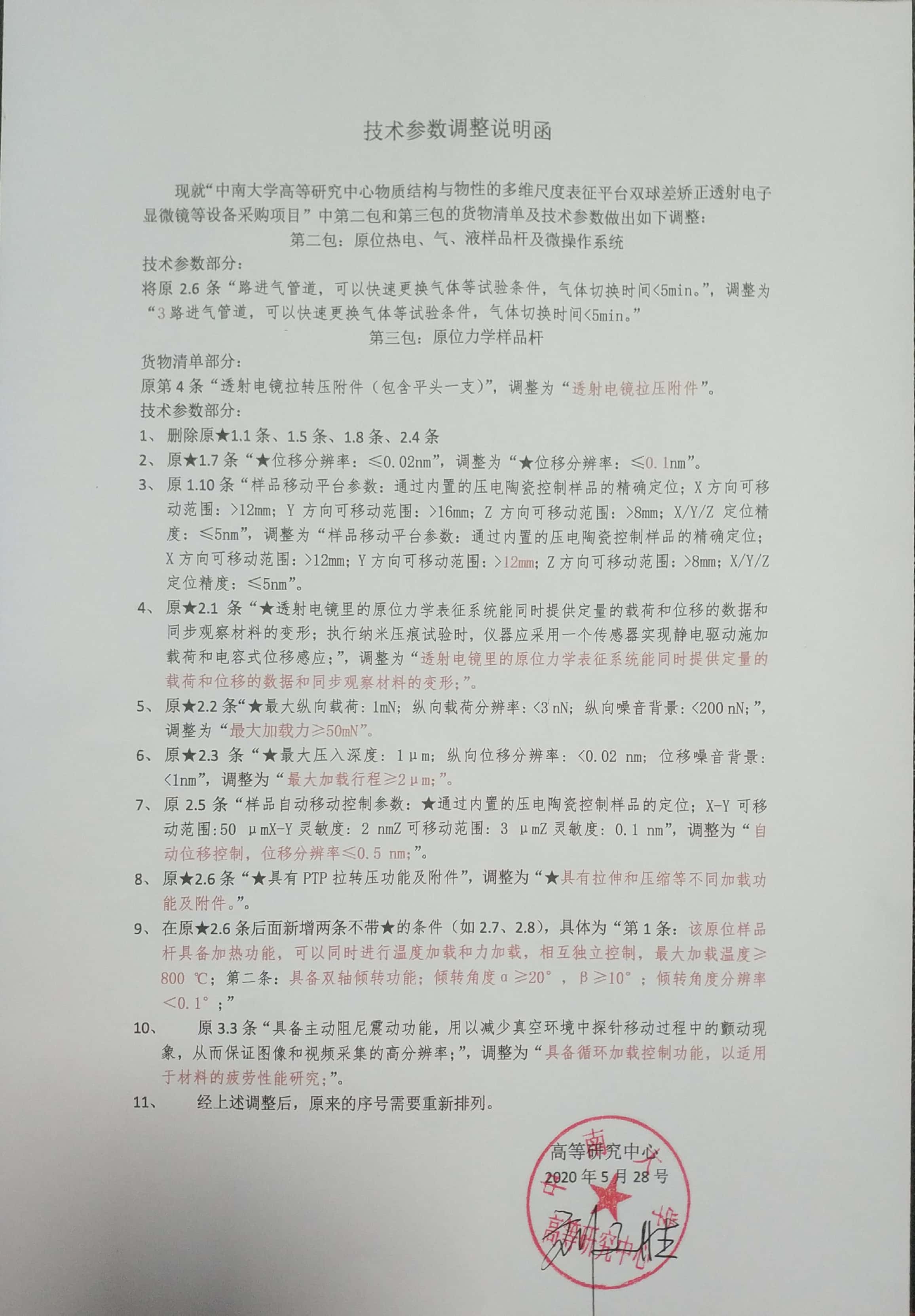 10、 原招标文件第四章技术规格、参数与要求中的第三包原位力学样品杆技术参数2.1条:“★透射电镜里的原位力学表征系统能同时提供定量的载荷和位移的数据和同步观察材料的变形;执行纳米压痕试验时,仪器应采用一个传感器实现静电驱动施加载荷和电容式位移感应;”现更正为:“透射电镜里的原位力学表征系统能同时提供定量的载荷和位移的数据和同步观察材料的变形。”